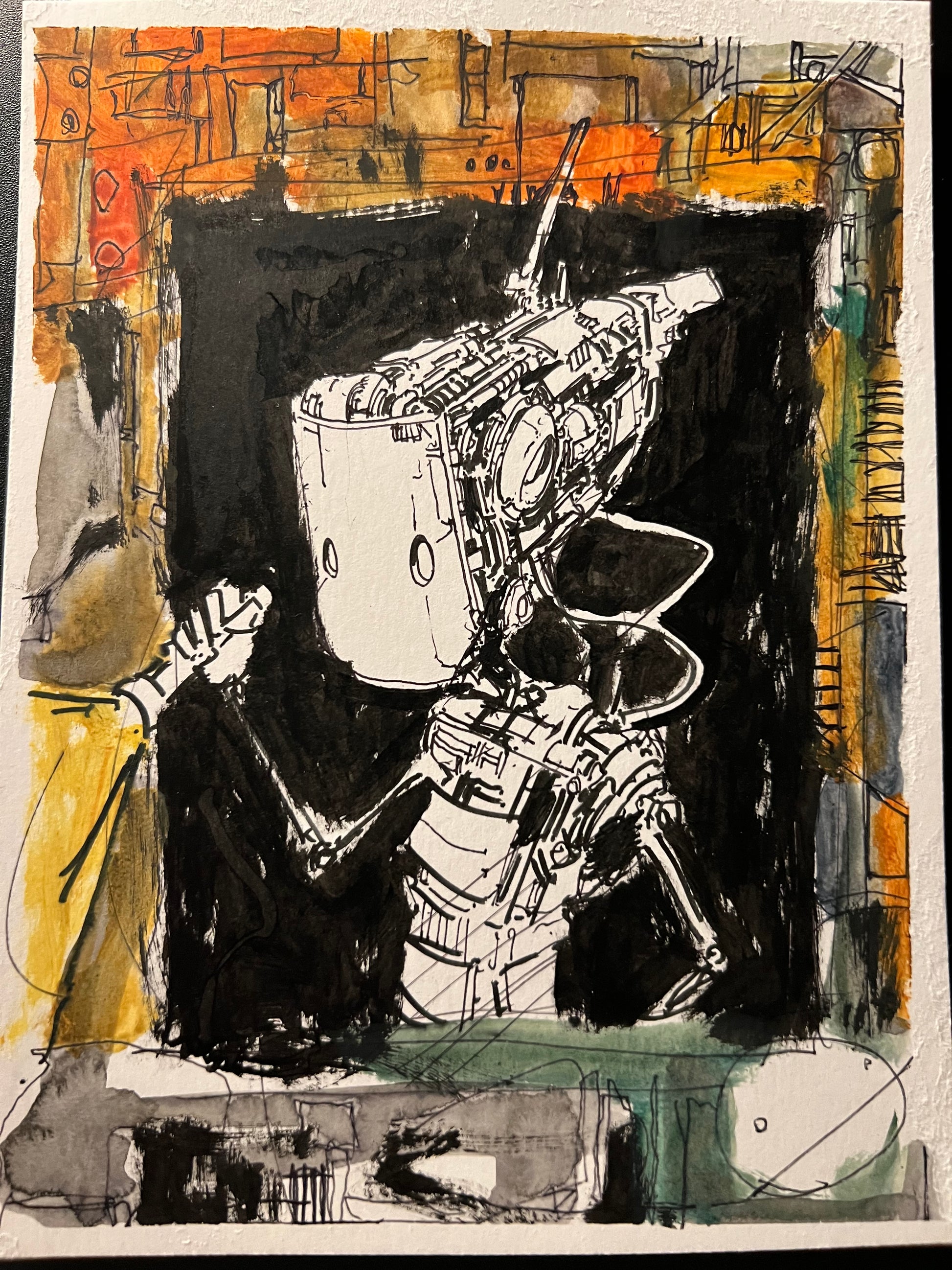 An experiment. I wanted to mash together my robot style with something a bit more artsy. It felt right in the moment, what started as a design for a new robot became an intuitive exercise. Used watercolor and Ink.