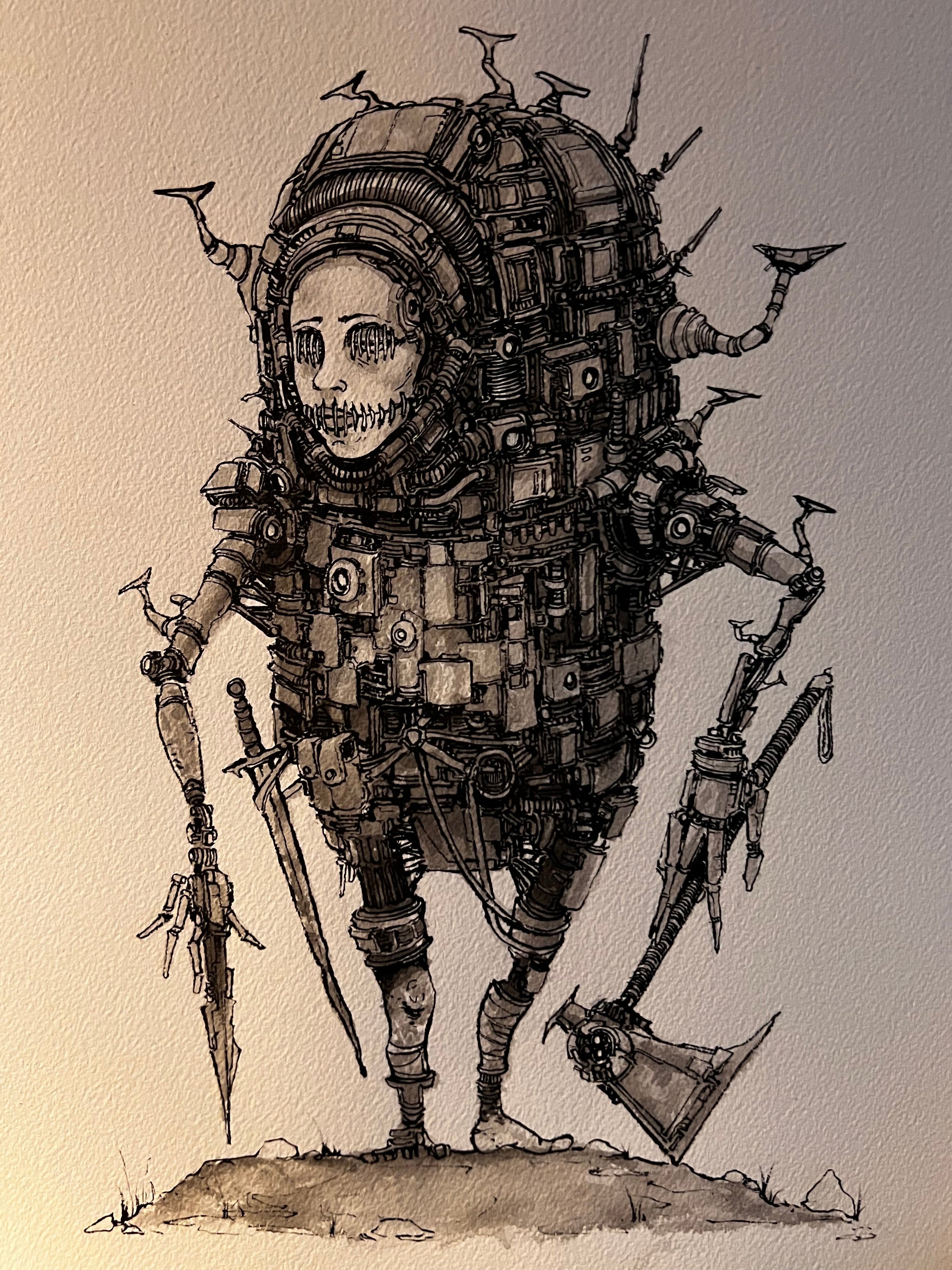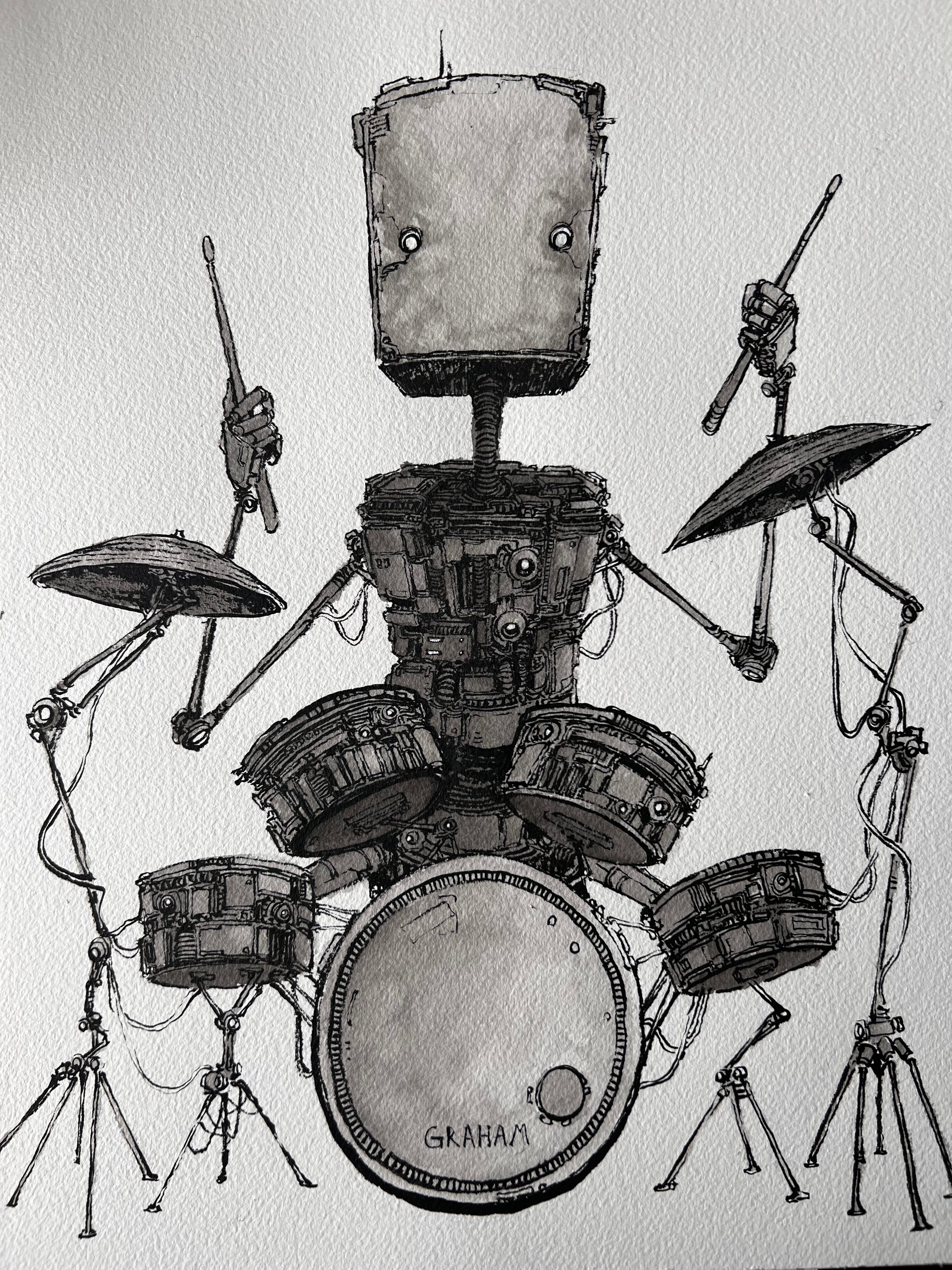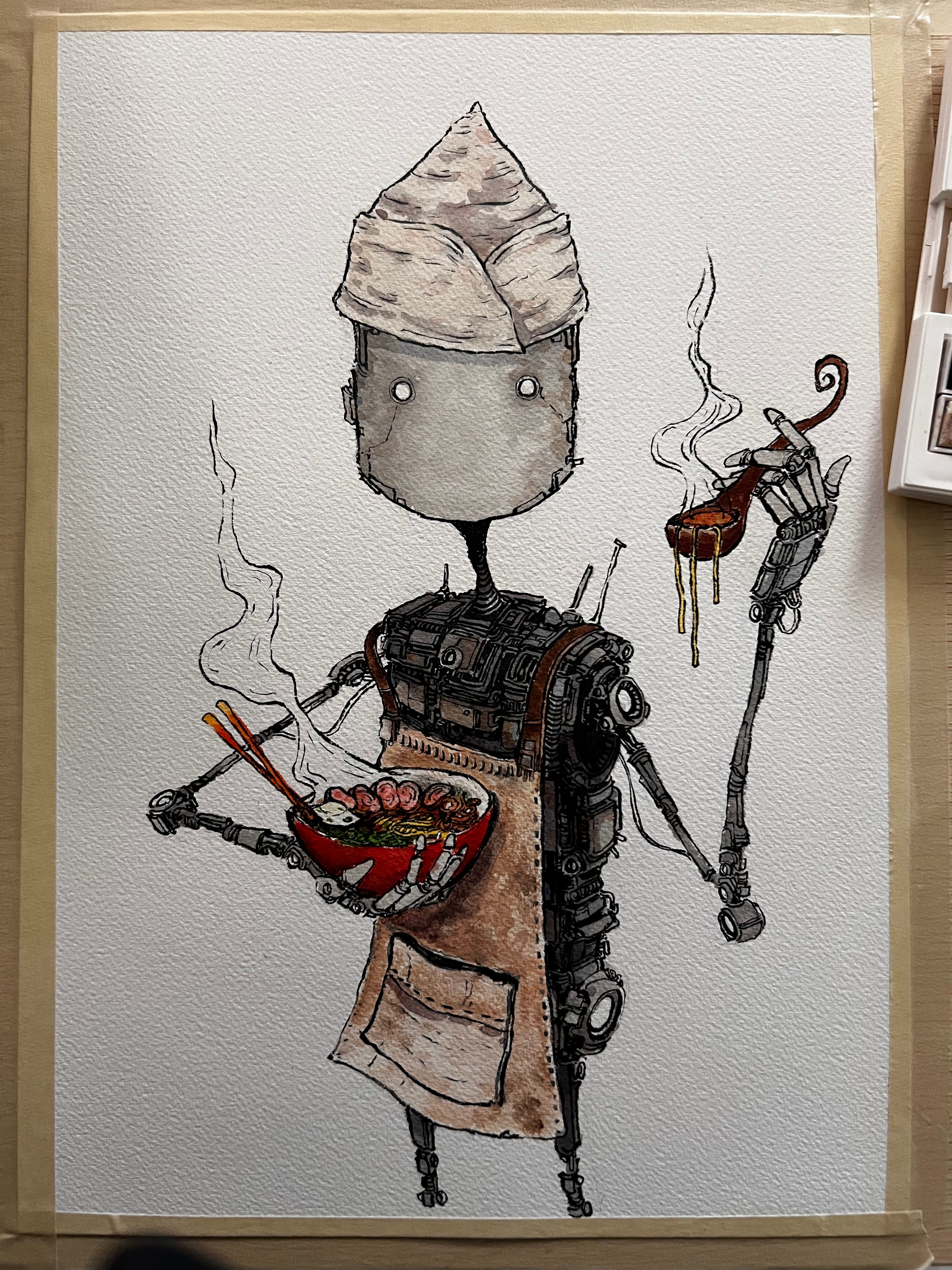Custom hand-drawn robot artwork created in ink or ink & watercolor.