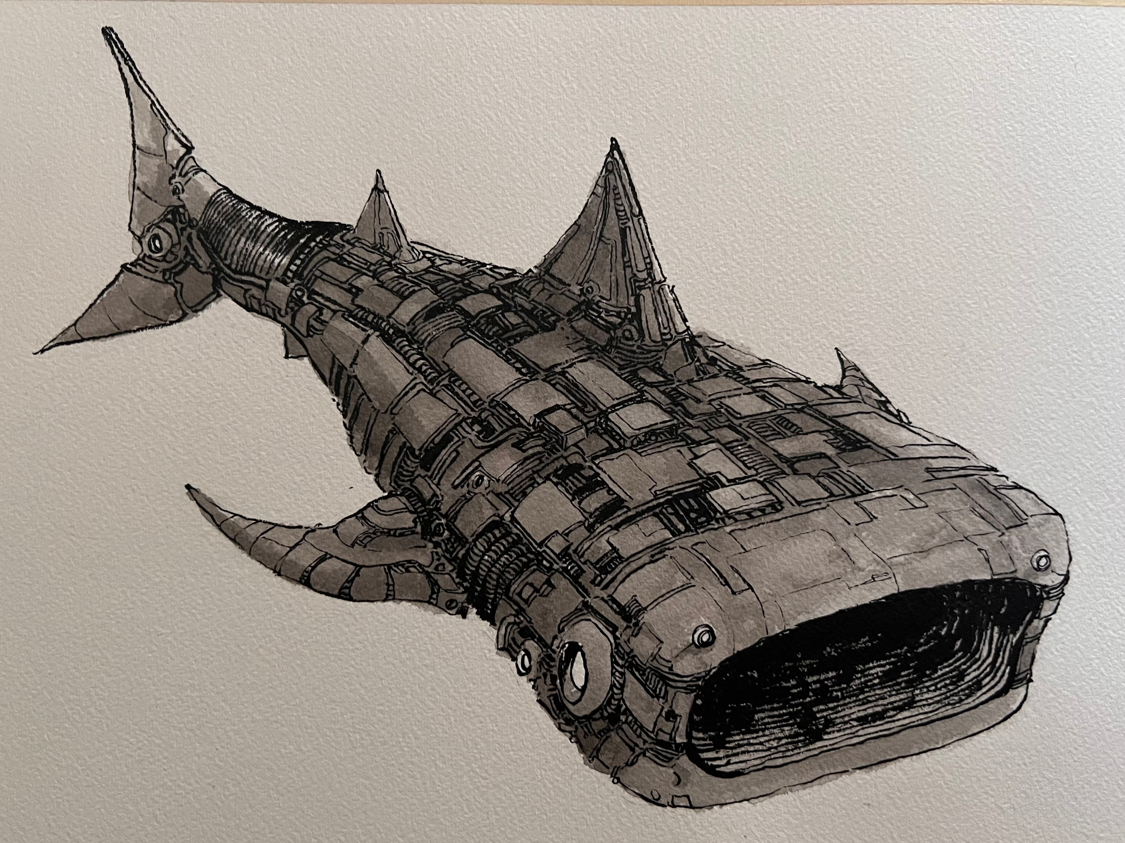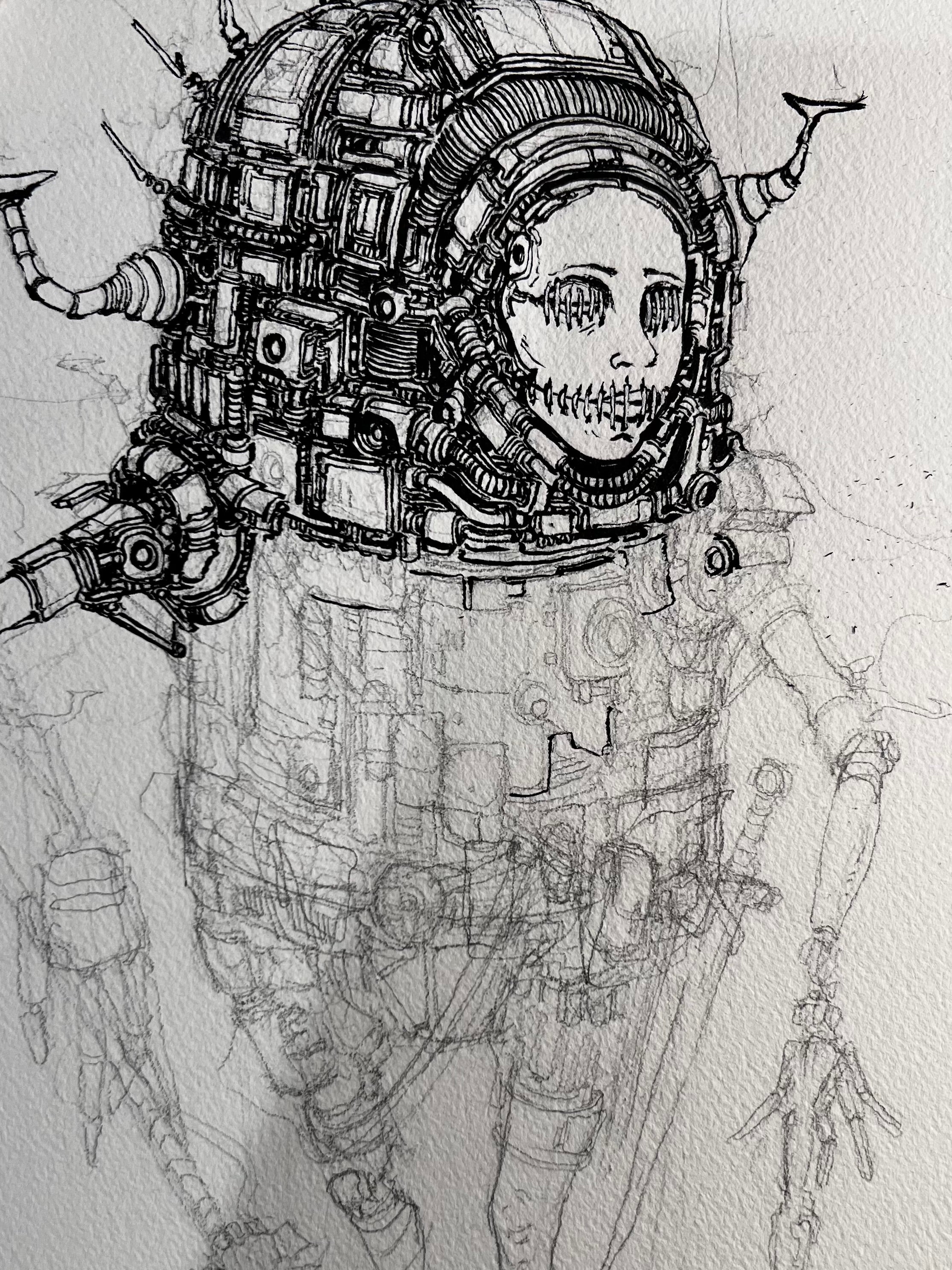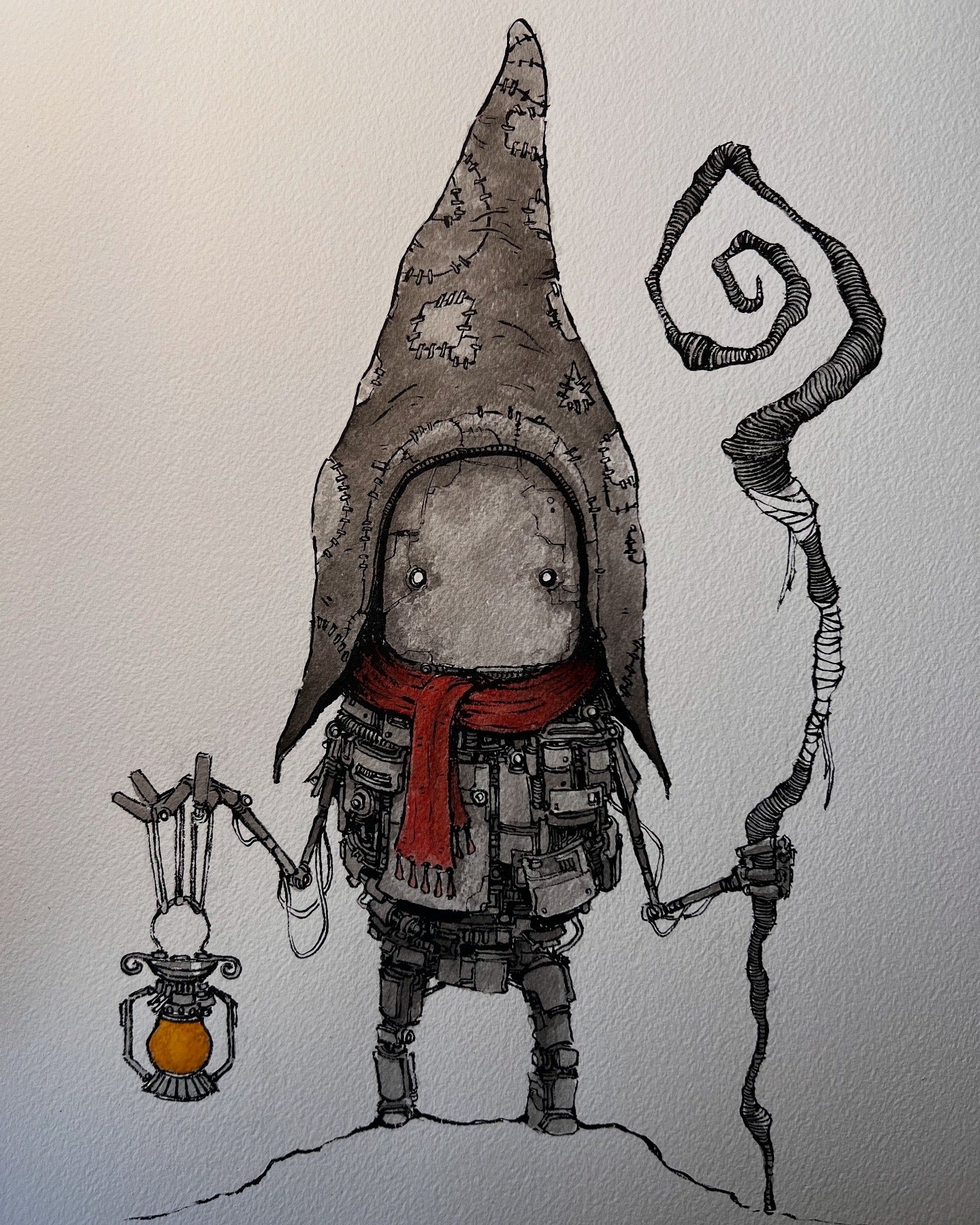 Custom hand-drawn robot artwork created in ink or ink & watercolor.