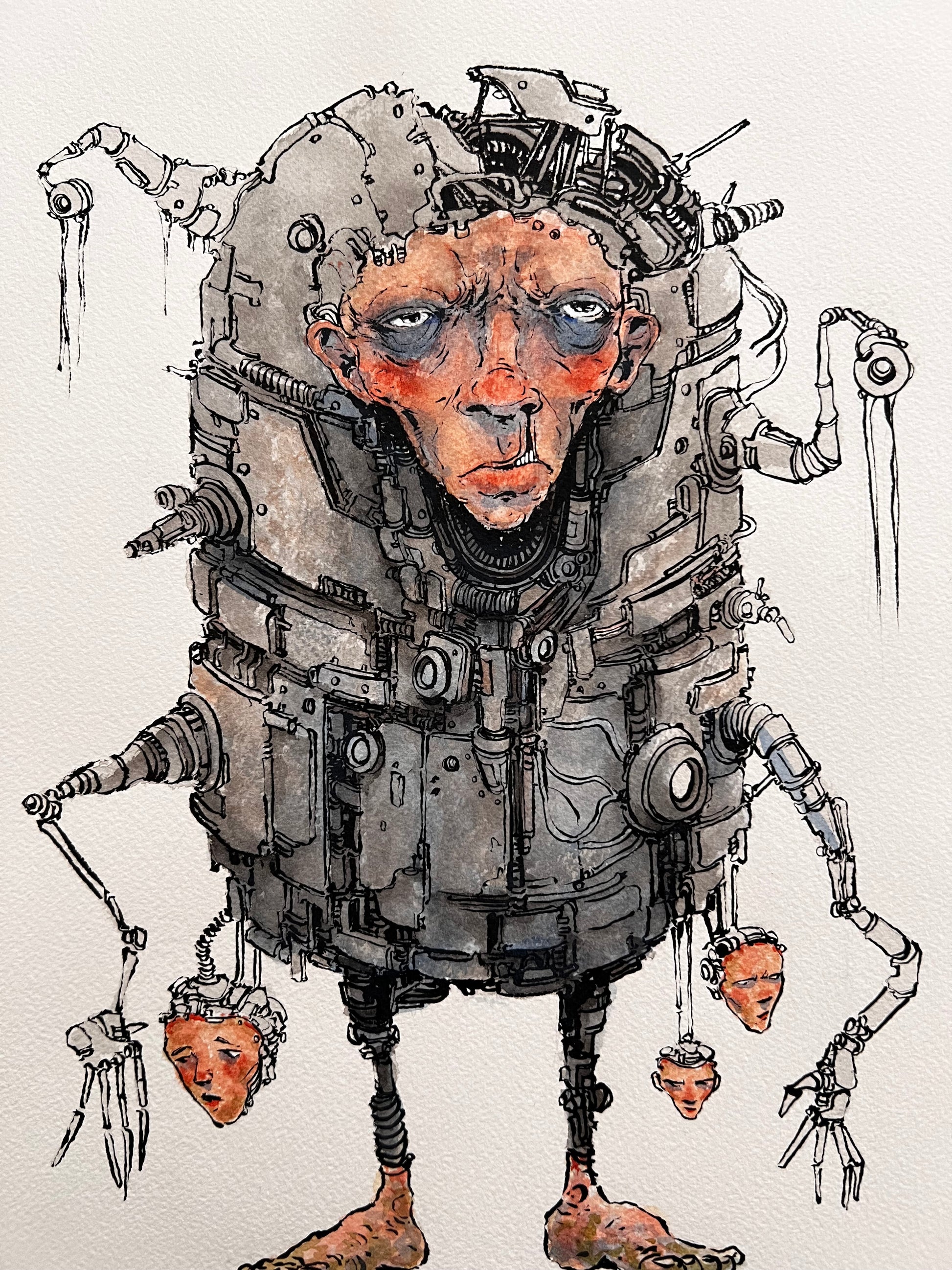 This was one of my first ever planned drawings using watercolor. This design will be elsewhere in the future, but for now it’s locked into this piece of paper. Kind of similar to my angel design, I was inspired by mixing human and technology. What if there was a very smart man who was put into an “Iron Lung” and survived some sort of apocalypse? I love to think about it.