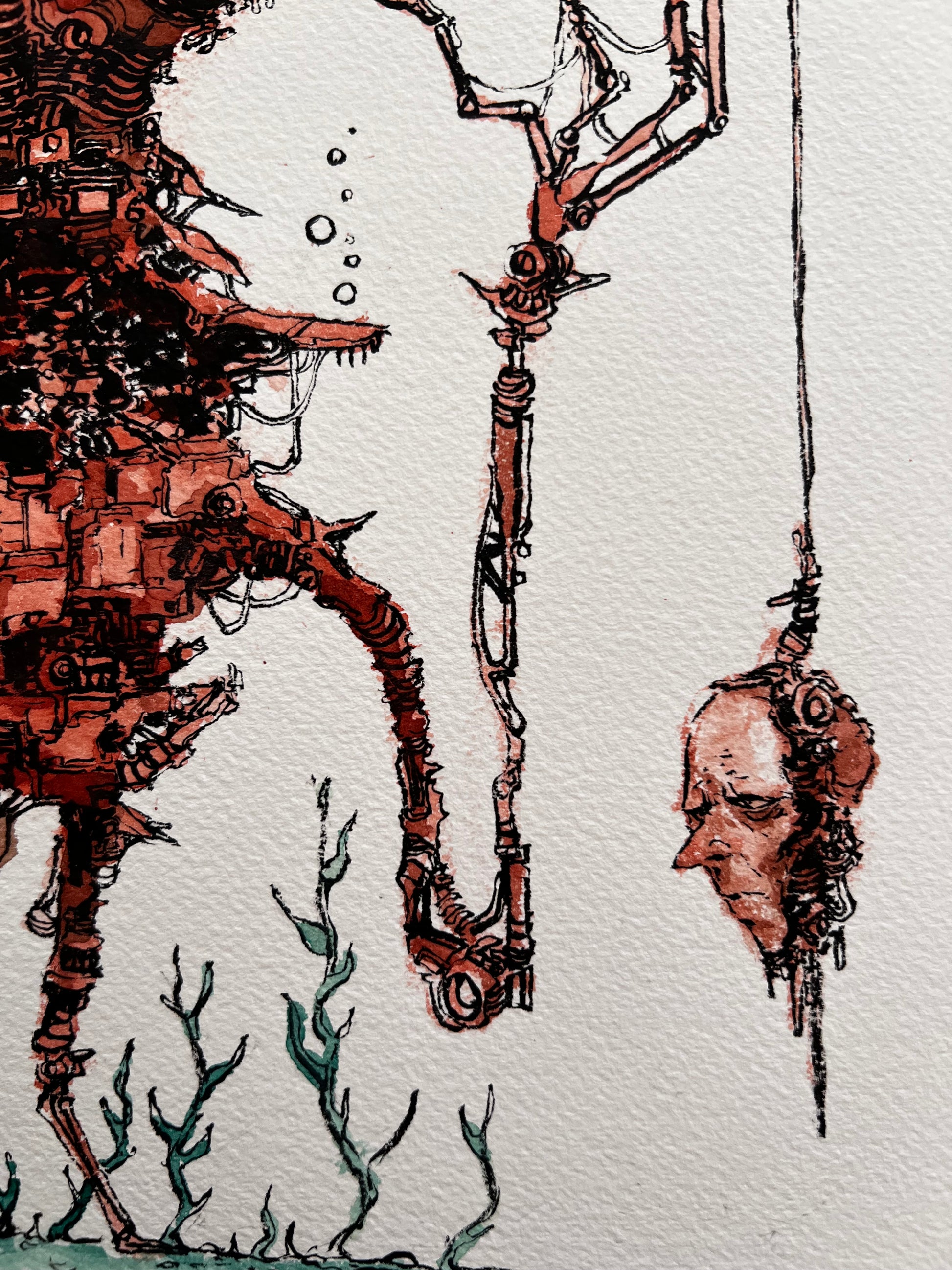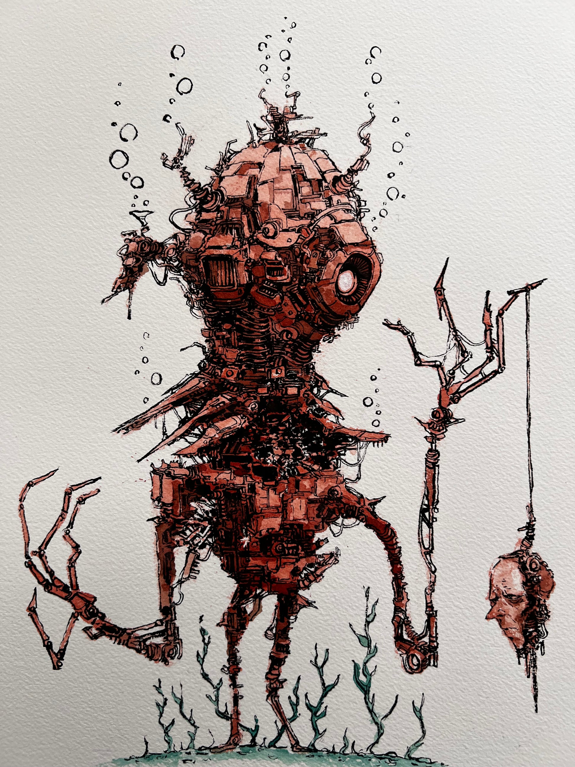 For this piece, I started with watercolor first. I wanted to utilize shades/values rather than pencil. It became more instinct and surreal rather than logical and based in fundamentals. I enjoyed it and will take what I learned. I took inspiration from the ocean and what I knew about old school diving suits. I’d like to think this guy has been stuck at the bottom of the Sea, waiting for rescue, cleaning things and fixing pipes. He unintentionally saved a multitude of high status infrastructures from plumbing & internet issues.