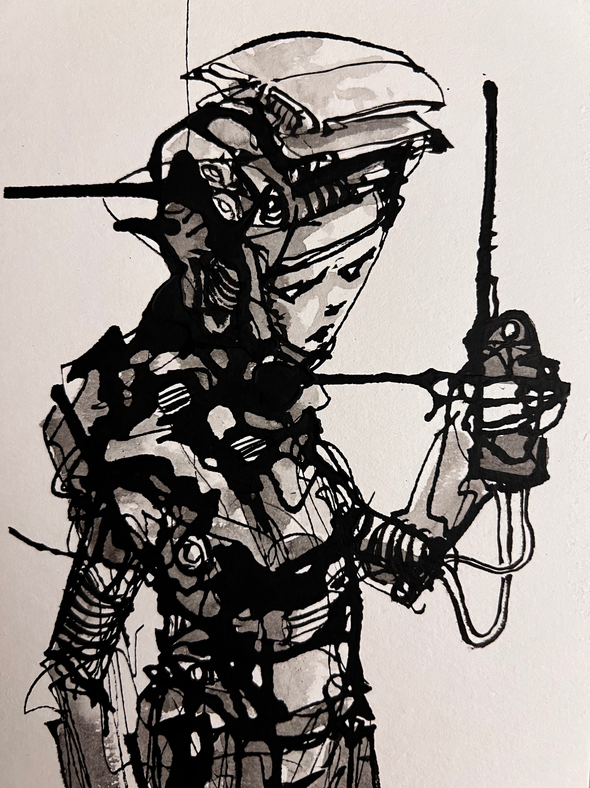 Done with ink dropper and grey wash. Lone astronaut trying to reach his coworkers.