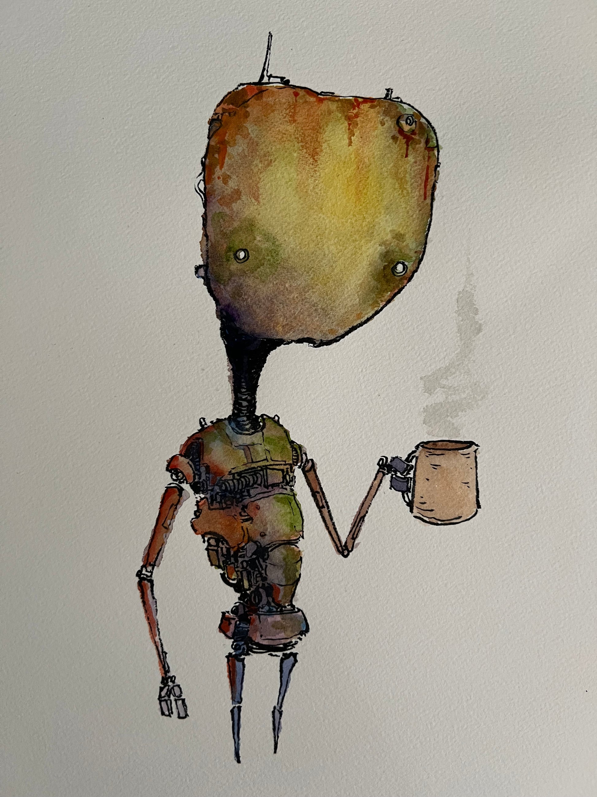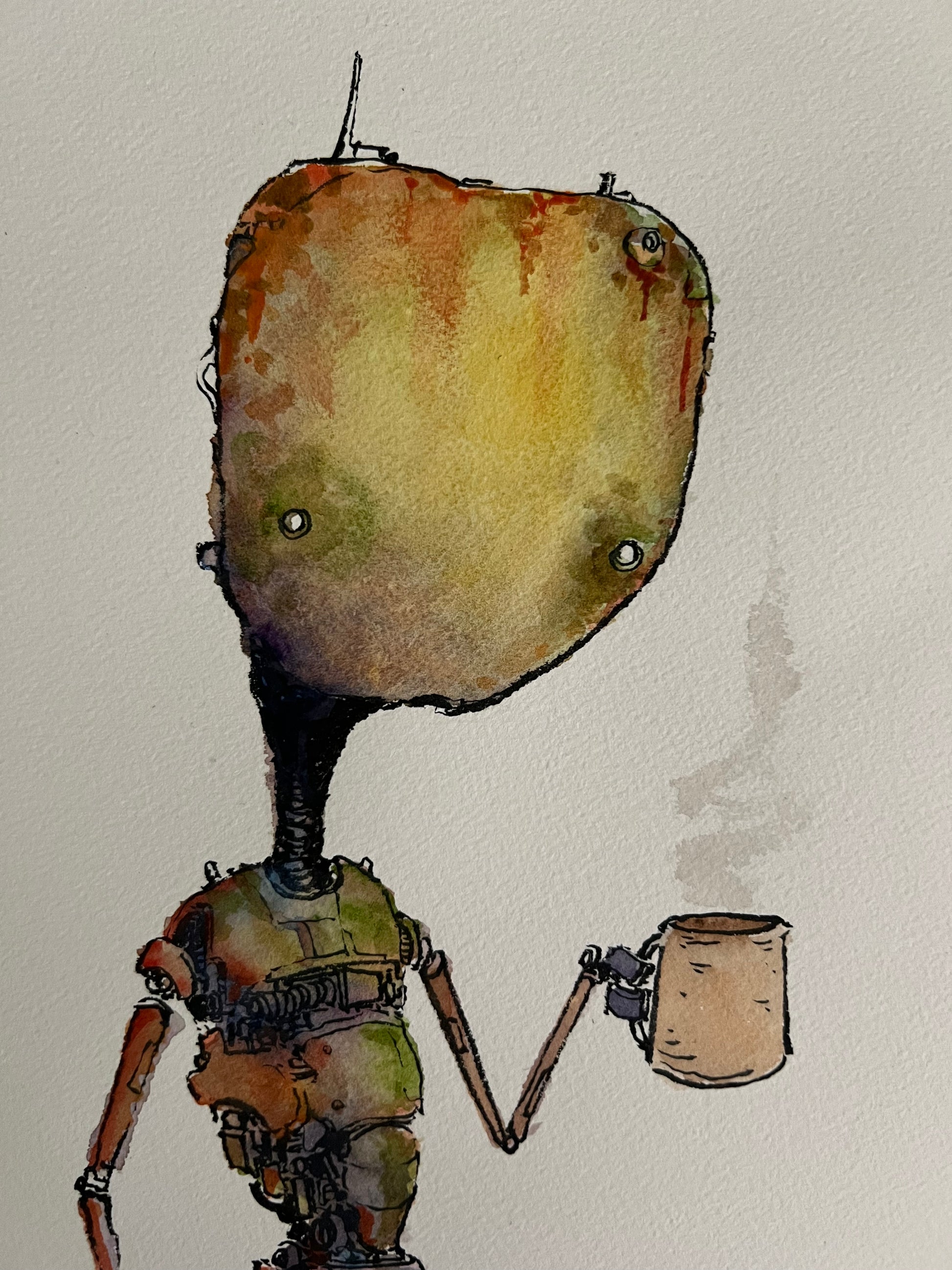 Steve 4 is a watercolor practice that has grown on me. He just made some coffee, he's about to go back to work. Steve 4 works with window cleaners. He himself doesn't clean windows really, but he watches others do it. Sometimes they let him try, Steve 4 isn't bad at cleaning windows.